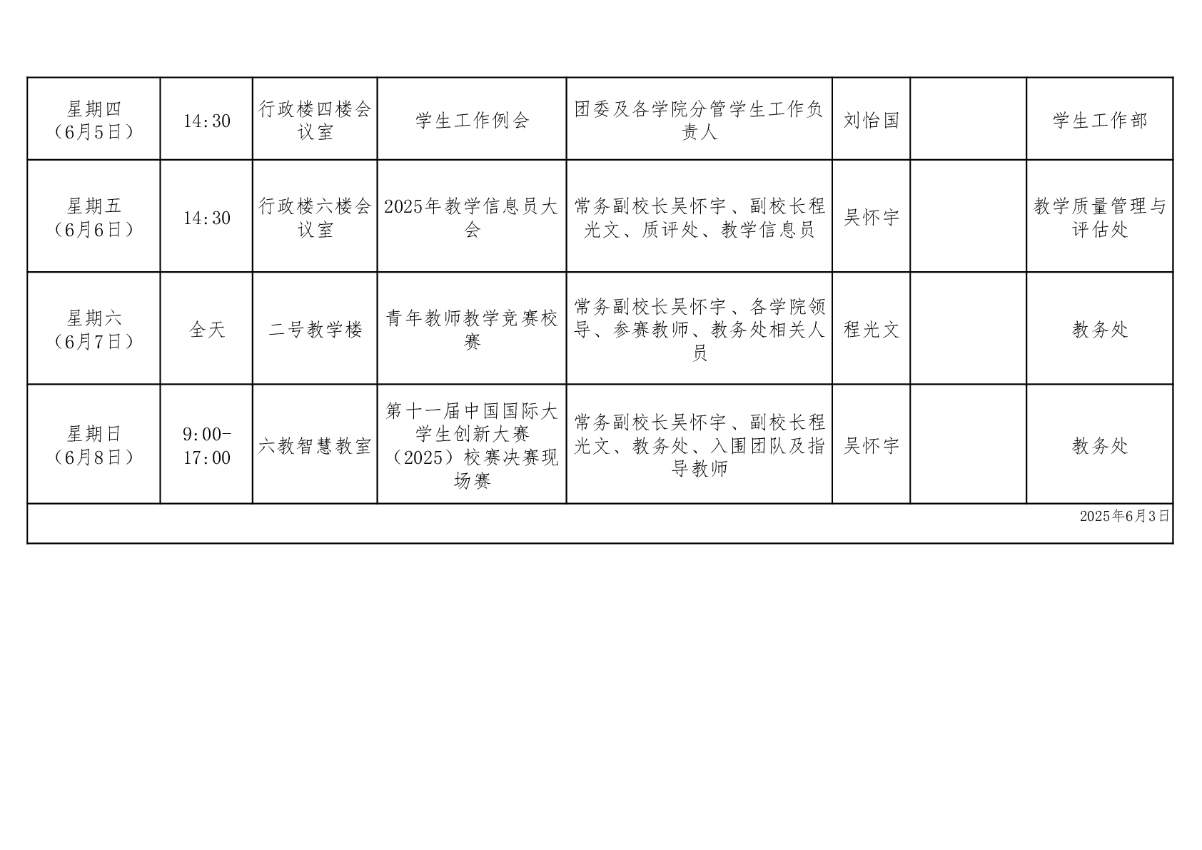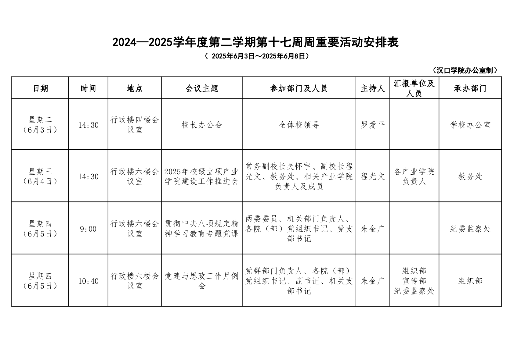 汉口学院校领导一周工作安排表(第十七周)
