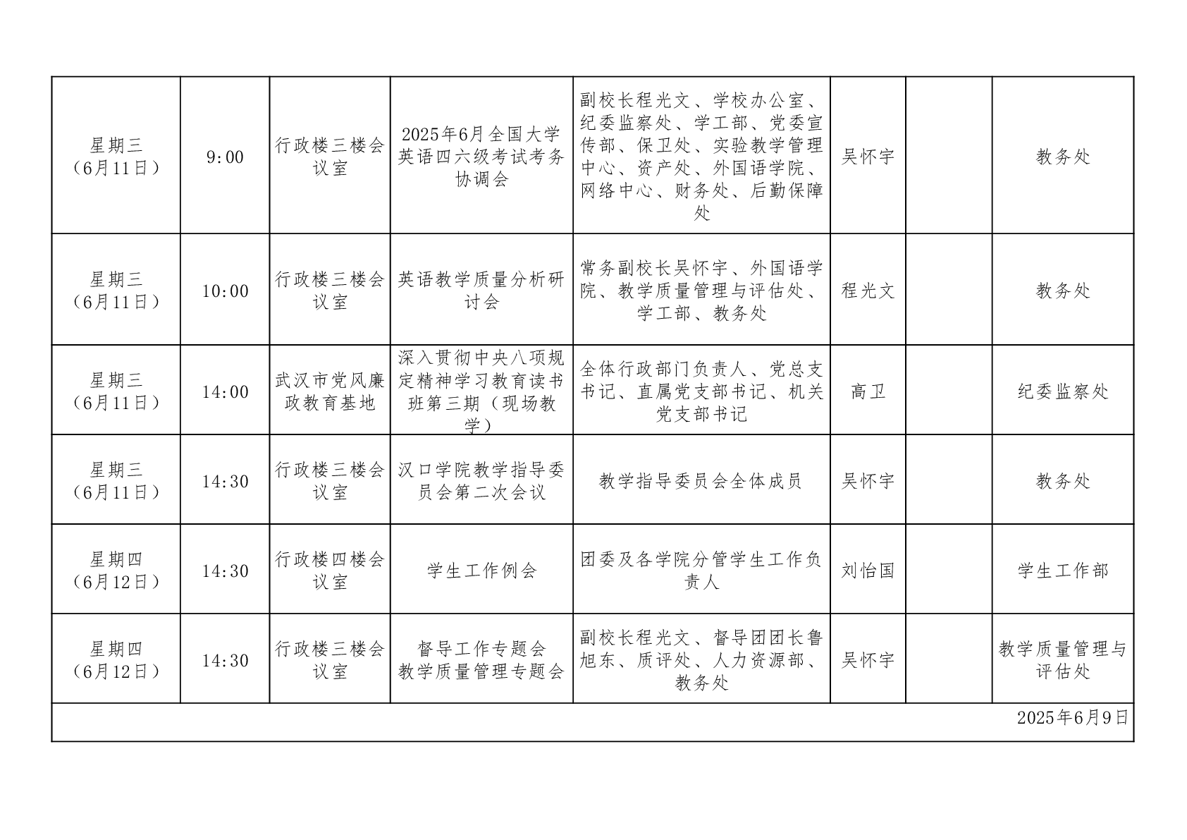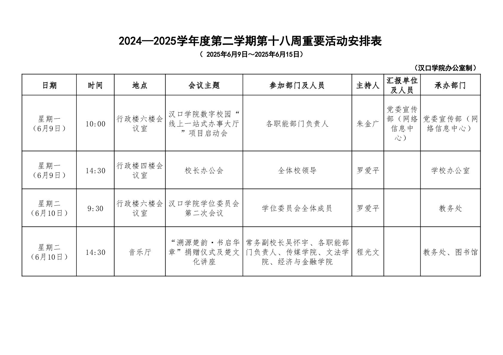 汉口学院校领导一周工作安排表(第十八周)