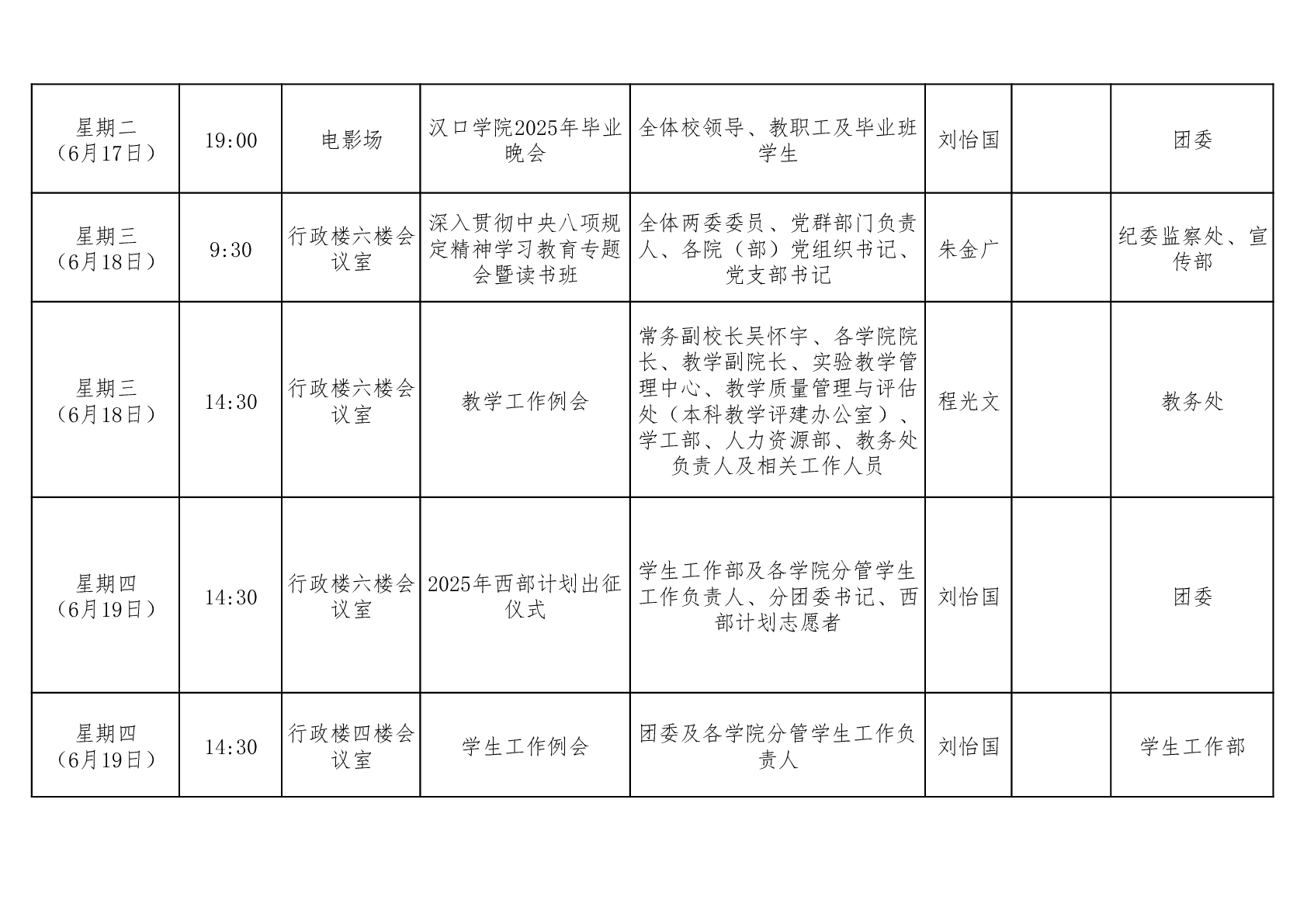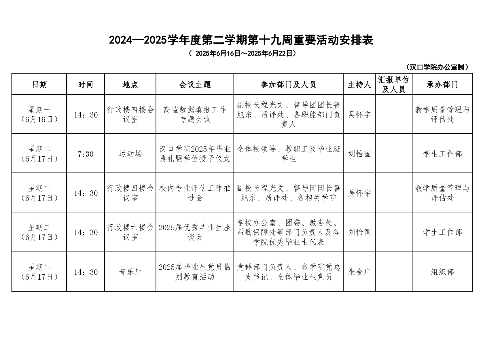 汉口学院校领导一周工作安排表(第十八周)