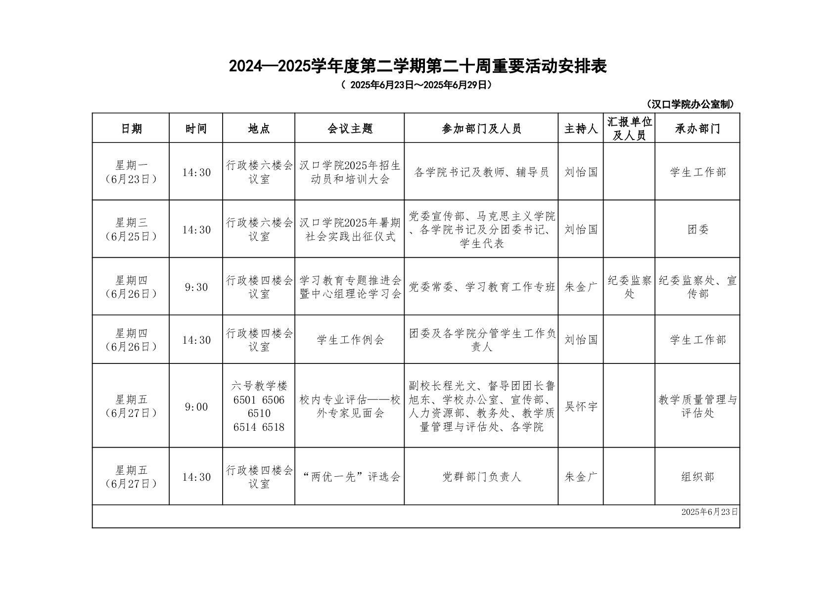 汉口学院校领导一周工作安排表(第二十周)